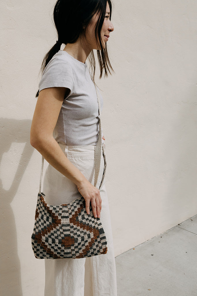 The Litoral Collection has travelled from isolated parts of Argentina known as Litoral zones, here members of the Wichí indigenous community hand-knit with fibres extracted from the chaguar, a native plant similar to aloe vera. Since time immemorial, they have used this technique to make bags for collecting fruit, fishing nets and traditional costumes. The durable, textured threads are coloured with natural dyes extracted from roots, seeds and fruits. Abstract designs are inspired by markings found on birds and snakes, and were traditionally used as talismans for spiritual protection.