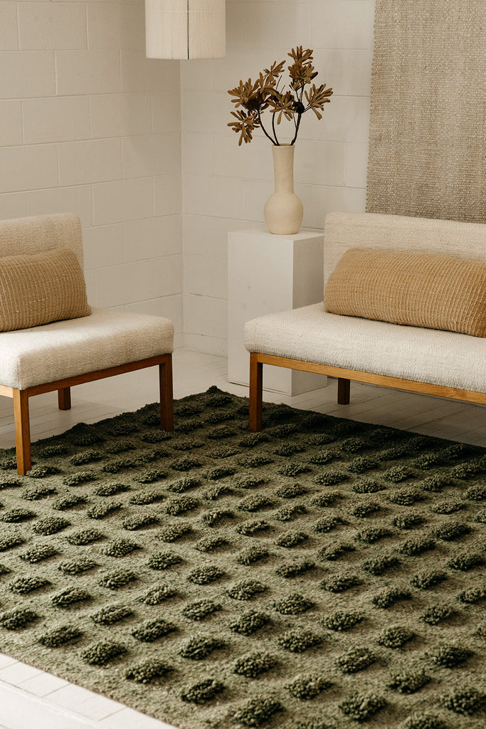 The Esther Rug from The Tufted Collection is crafted from Argentinian Sheep's Wool in our Thick Weave handspun in a chunky yarn for extra textures underfoot. Featuring a Moss base, Moss tufts, and a soft, thick texture, offering a layered softness that provides durability and comfort. The reason why this rug is so loved? It offers the most luxurious, soft feeling underfoot.