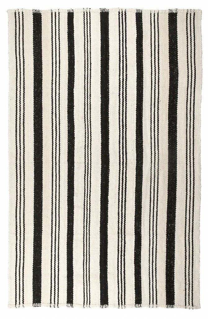 The Josefa Rug from The Linear Collection features a bold vertical pattern, woven in a thick weave. The design includes prominent black lines running the length of the rug, with thinner black lines alongside them, all set against a natural base. This interplay of thick and thin lines creates a dynamic and textured effect.